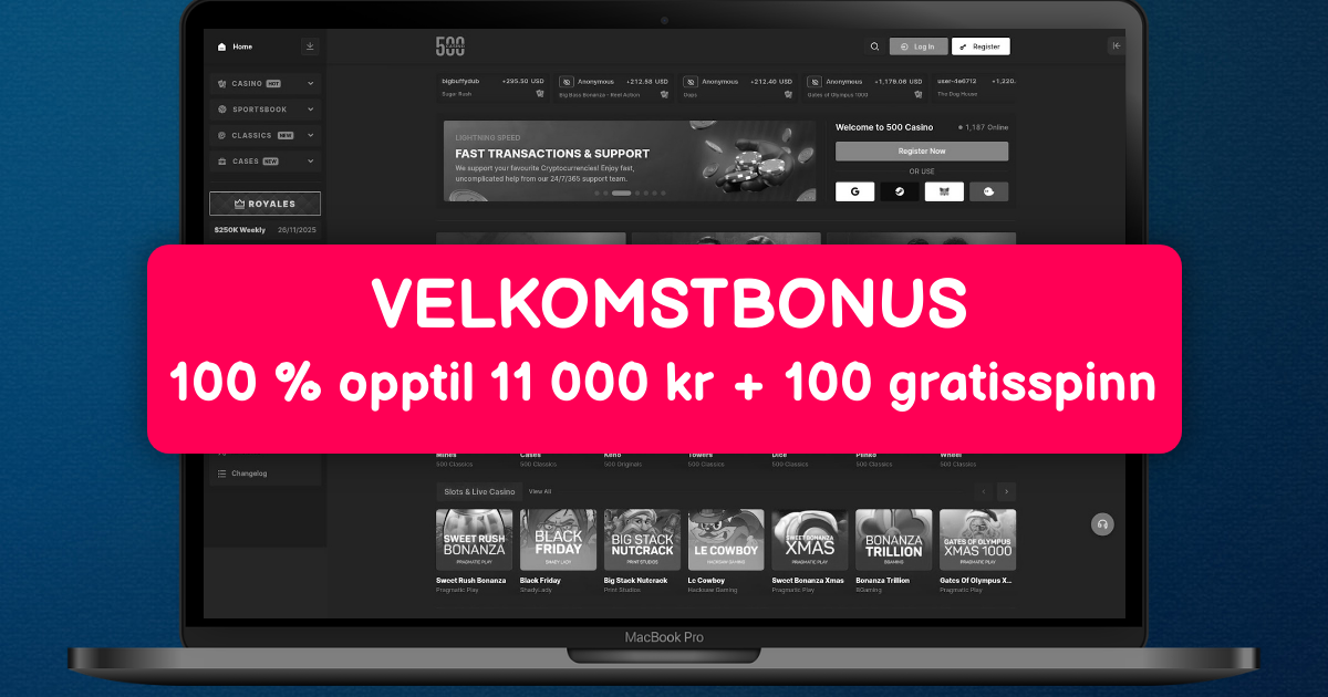 500 Casino er et globalt nettcasino og sportsbook som har etablert seg som en ledende plattform innen online gambling. Vi kombinerer casinospill og sportsbetting på en enhetlig plattform, med særlig vekt på kryptovaluta-integrasjon og raske transaksjoner.